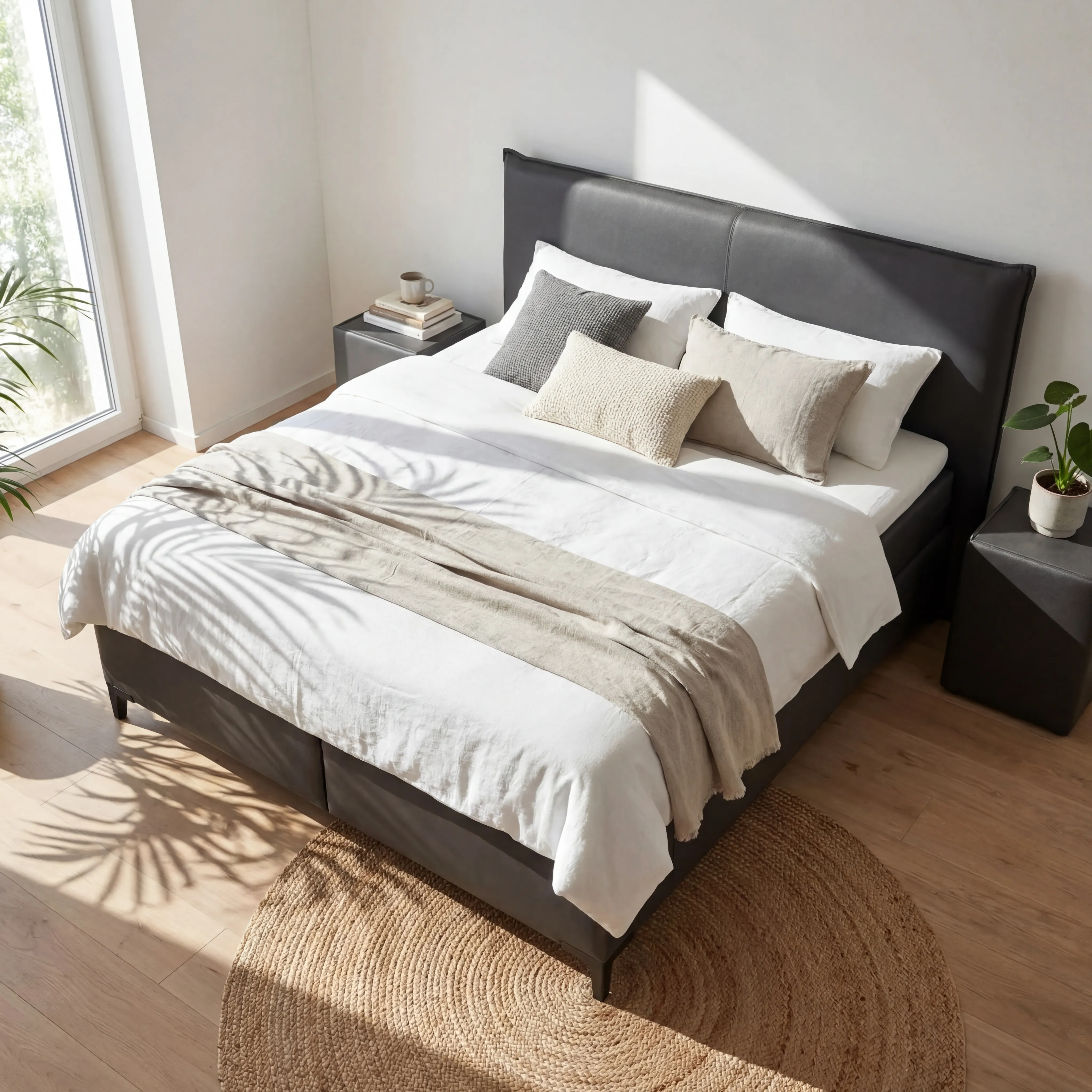 Mit Schwarz kannst Du sehr flexibel spielen. Weiß und Creme wirken klassisch-clean, Sand und Taupe machen es warm, und Dunkelgrün oder Nachtblau sehen besonders luxuriös aus. Wenn Du das Bett optisch leichter wirken lassen willst, setze auf helle Bezüge und eine strukturierte Tagesdecke. Für ein Boutique-Hotel-Gefühl funktionieren mehrere Lagen und unterschiedliche Materialien besonders gut.