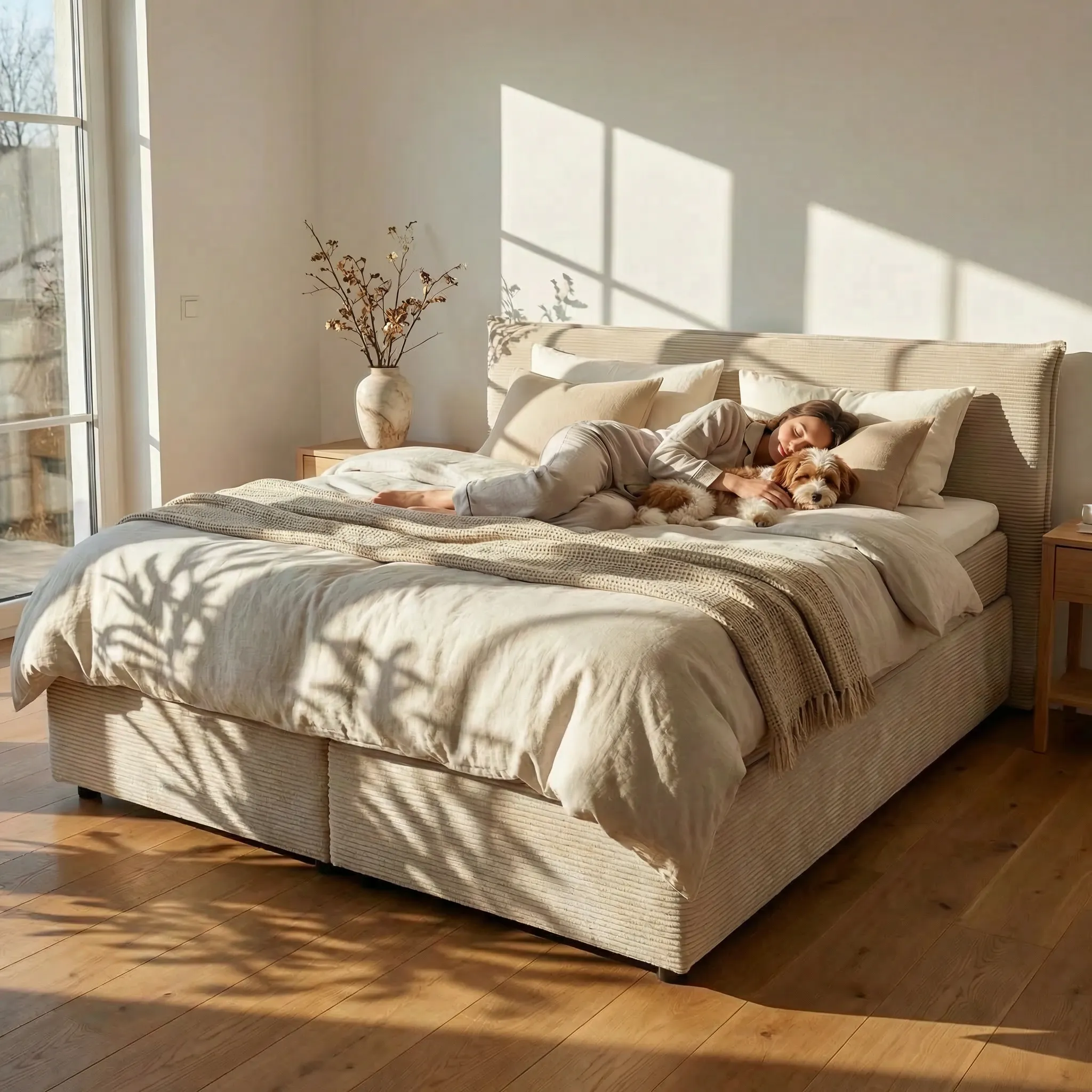 Ein Boxspringbett 240x200 ist ideal, wenn Du Dir im Schlafzimmer wirklich maximalen Platz wünschst: als Familienbett mit Kind(ern), für Paare mit großem Bewegungsradius oder wenn Haustiere mit ins Bett dürfen. Die Überbreite reduziert Störungen durch Drehen und Positionswechsel deutlich. Und das Beste: Du bekommst nicht nur Größe, sondern den vollen Mozart Komfort – individuell konfigurierbar von Stoff und Kopfteil bis zu Matratze, Topper und Härtegrad.