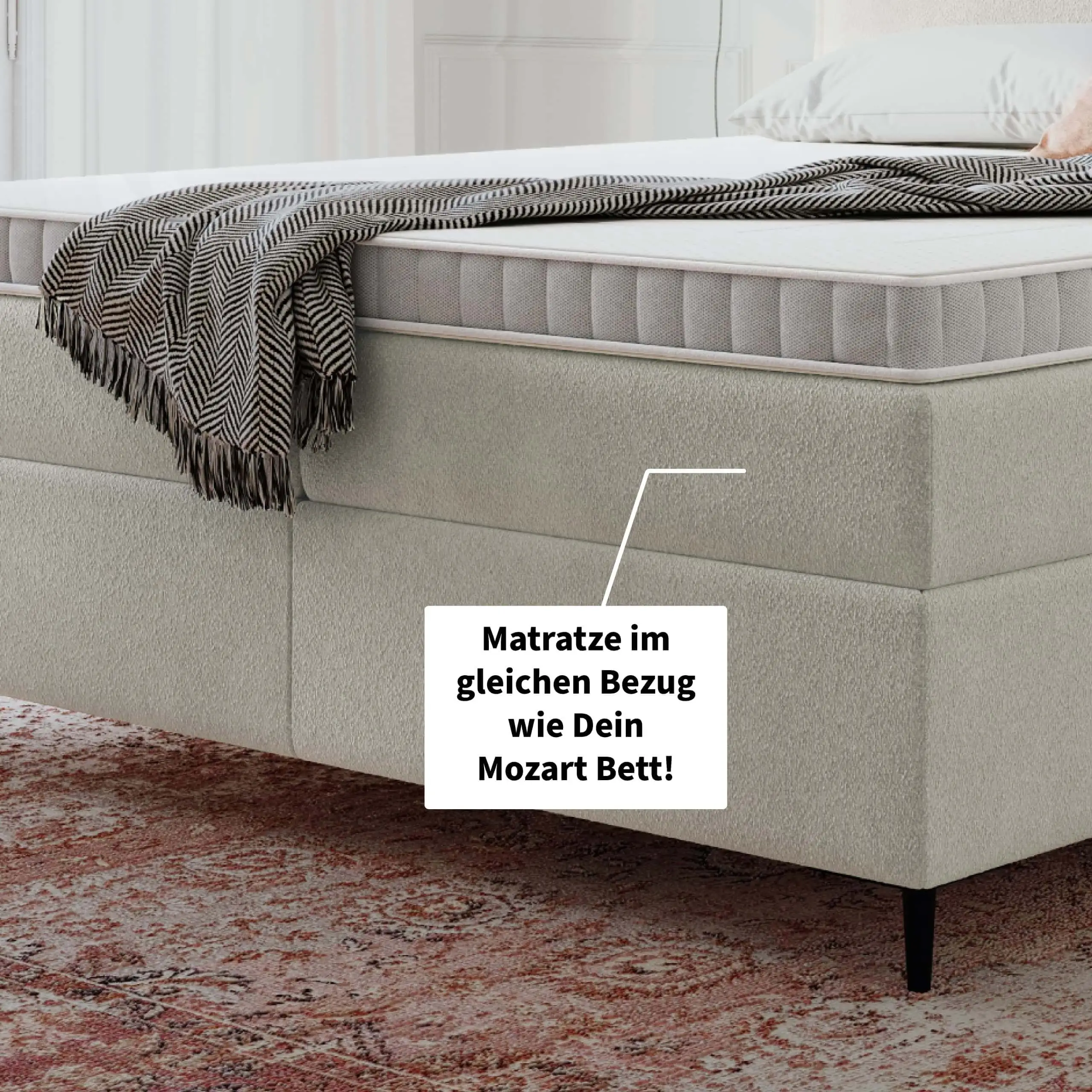 Die Matratze wird in Deinem ausgewählten Boxspringbettmöbelstoffbezug angefertigt. Dadurch kannst Du einen einheitlichen Look und ein schönes Schlafzimmer genießen.